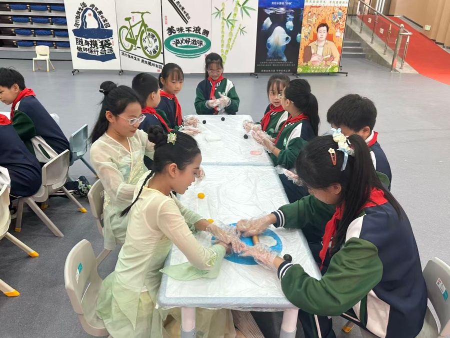 在手工实践环节,志愿者耐心指导学生制作冰皮月饼,揉面、包馅、压模……不一会儿,一个个模样可爱、寓意团圆的月饼便在孩子们手中诞生。另一边的漆扇制作区,同学们在绘有月亮、玉兔、桂花等中秋元素的白色纸扇上创作出各具特色的图画。孩子们专注投入、互相帮助,不仅锻炼了动手与协作能力,也体验到劳动与传统手工艺的乐趣。